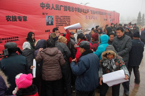 2012年12月14日,中國鄉(xiāng)村之聲“愛在鄉(xiāng)村”公益團(tuán)隊(duì)走進(jìn)山東省汶上縣,開展“廣播惠農(nóng)”公益活動。這次活動邀請來農(nóng)業(yè)部小麥專家指導(dǎo)組成員趙廣才、北京大學(xué)第一醫(yī)院急診科主任醫(yī)師汪波等專家,為汶上老百姓送來科技知識、健康體檢等服務(wù)。除此之外,還有一場精彩的文化演出,國內(nèi)著名播音藝術(shù)家方明、著名藏族歌手索朗扎西、農(nóng)民歌手朱之文等同臺獻(xiàn)藝,為當(dāng)?shù)厝罕妿硪粓鑫幕蟛汀?/p>
