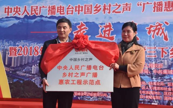 中央人民廣播電臺社教節(jié)目中心副主任陶煒授“中央人民廣播電臺中國鄉(xiāng)村之聲廣播惠農(nóng)工程示范點”牌匾,蕉城區(qū)人民政府副區(qū)長黃曉鶯接牌。