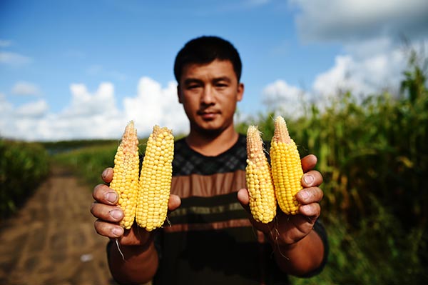 9月6日,黑龍江省富?h龍安橋鎮(zhèn)富欣村的種糧大戶袁鳳波在展示受旱情影響的“禿尖”玉米。袁鳳波今年種植玉米約2000畝,他預(yù)計(jì)受旱情影響將減產(chǎn)約五成。