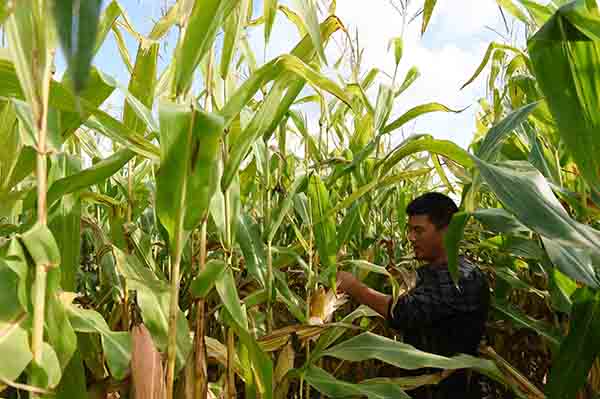 9月6日,黑龍江省富?h龍安橋鎮(zhèn)富欣村的種糧大戶袁鳳波在查看自家玉米受旱情影響情況。袁鳳波今年種植玉米約2000畝,他預(yù)計(jì)受旱情影響將減產(chǎn)約五成。