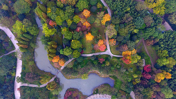 11月13日,從空中俯瞰,揚州瘦西湖萬花園色彩斑斕。
