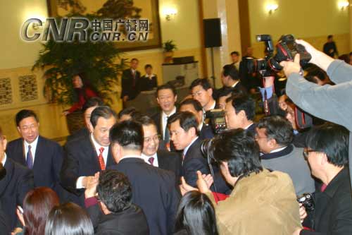 記者招待會(huì)后,眾記者"追訪"溫總理。中國(guó)廣播網(wǎng) 陸敏 攝