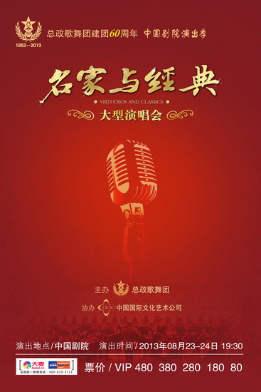 大型演唱會《名家與經(jīng)典》以全明星陣容在中國劇院上演,以內(nèi)部紀念專場的形式正式拉開總政歌舞團60周年“中國劇院演出季”的帷幕。8月23日、24日,總政歌舞團的歌唱家們還將連續(xù)兩天為普通觀眾獻上該經(jīng)典演出。