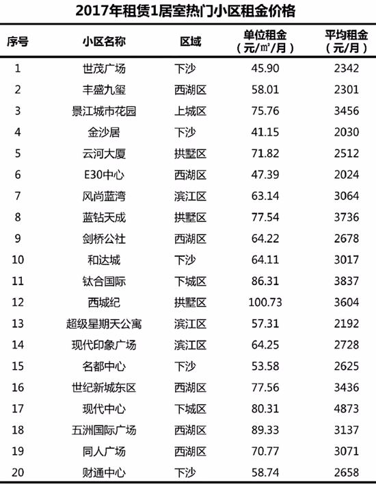 在杭州我愛我家提供的2017年前20個最熱門的一居室租賃小區(qū)中,下沙板塊上榜的有世茂廣場、金沙居、和達城、名都中心、財通中心5個,其中平均月租金最低是金沙居,2030元/月;最高的是財通中心,月租2658元/月。相比之下,在這份榜單中,西湖區(qū)上榜的熱門一居室小區(qū)中,月租最高的世紀新城東區(qū)是3436元/月;下城區(qū)月租最高的現(xiàn)代中心是4873元/月;濱江區(qū)月租最高的風尚藍灣是3064元/月;拱墅區(qū)月租最高的藍鉆天成是3736元/月;上城區(qū)月租最高的景江城市花園是3456元/月。(記者 李毅恒 徐叔競)