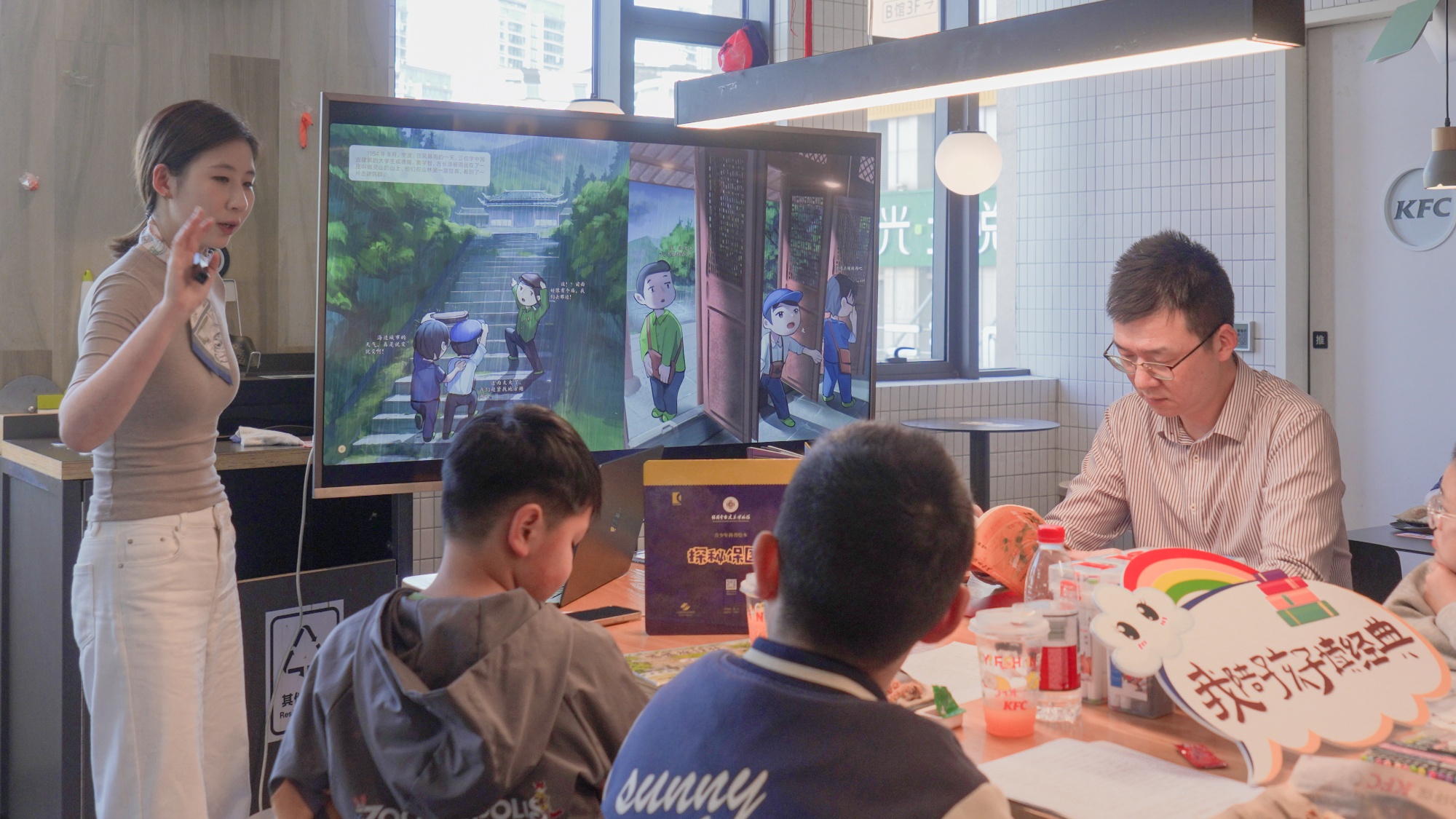 孩子和家長在“我陪孩子讀經(jīng)典×KFC閱讀主題餐廳”共讀一本書(央廣網(wǎng)記者 俞燁 攝)