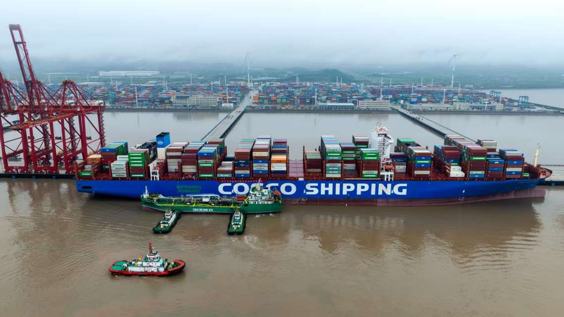 據(jù)了解,“大慶268”輪為載重噸7500噸的雙燃料甲醇加注船,總艙容約10362立方米。“中遠(yuǎn)海運(yùn)天秤座”輪總長(zhǎng)399.8米,為2萬標(biāo)準(zhǔn)箱級(jí)甲醇雙燃料集裝箱船。