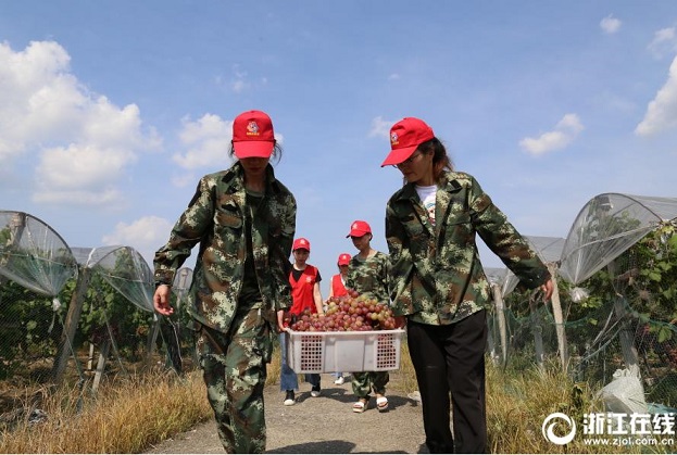 8月10日,湖州市吳興區(qū)埭溪鎮(zhèn)的一處葡萄園里,來自鎮(zhèn)機(jī)關(guān)團(tuán)委、婦聯(lián)的10多位黨團(tuán)員志愿者在幫果農(nóng)搶收葡萄。7月下旬以來,果農(nóng)種植的葡萄進(jìn)入豐產(chǎn)期,但面臨采摘、銷售難題。該鎮(zhèn)團(tuán)委、婦聯(lián)和電商服務(wù)中心等多部門伸出援手,不僅聯(lián)系客戶到葡萄園收購,還通過各種平臺,及時(shí)為果農(nóng)發(fā)布銷售信息,解決葡萄銷售問題。(浙江在線拍友 鄧德華 攝)