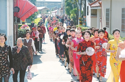 昨日,藍天白云下的鄞州區(qū)姜山鎮(zhèn)陸家堰村處處歡聲笑語。當天,白鶴街道丹頂鶴社區(qū)的150多位客人,帶著形式多樣的文藝節(jié)目,走進陸家堰村。據(jù)介紹,陸家堰村正在創(chuàng)建全國文明村莊,而丹頂鶴社區(qū)正在創(chuàng)建全國文明社區(qū),通過這次文化走親活動,村莊、社區(qū)相互借鑒,共建文明。圖為身著旗袍的“鋒之社”舞蹈戲曲隊的成員,在村里展示旗袍秀。(記者 胡龍召 范丁杰)