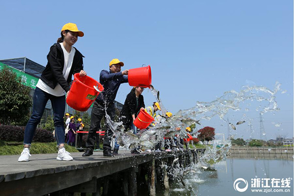 江蘇:蘇州舉行第四屆公益放魚活動(dòng) 投放魚苗潔凈太湖水,4月8日,第四屆“保護(hù)母親湖 我們?cè)谛袆?dòng)”潔凈太湖水公益放魚活動(dòng)在江蘇蘇州舉行,志愿者在活動(dòng)中投放魚苗。潔凈太湖水放魚公益活動(dòng)已持續(xù)4年,累計(jì)投放花白鰱魚、鲴魚苗18萬(wàn)尾。