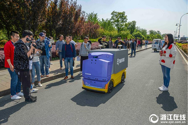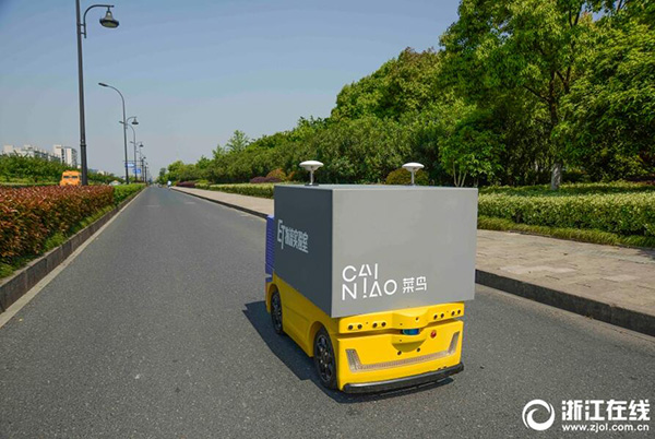 2018年4月18日,在杭州市文一西路上,一輛半人高的四方小車,在無人駕駛的情況下,一路停停走走,行駛在送快遞的路上。據(jù)了解,這是菜鳥旗下ET物流實驗室研發(fā)的無人車,正在進(jìn)行路測。當(dāng)日,在10公里的路測路段,無人車已經(jīng)能夠完成內(nèi)部的文件等收發(fā)配送。菜鳥無人車定位在末端配送,車速最高控制在15km/小時,車輛制動距離可以控制在0.5——0.3米。菜鳥無人車量產(chǎn)商用在即,年內(nèi)將全面進(jìn)入末端進(jìn)行配送。(記者 楊曉軒 攝)