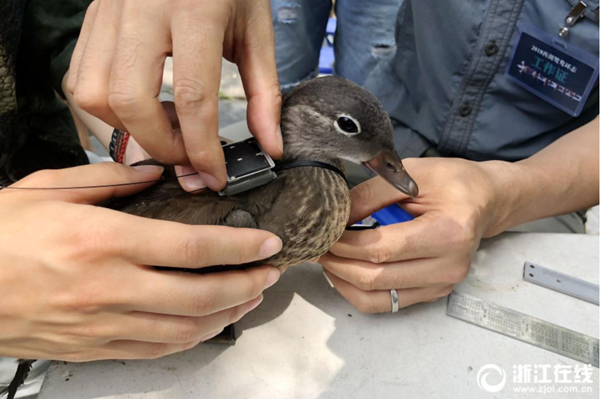 6月21日,杭州孤山畔,全國(guó)鳥(niǎo)類環(huán)志中心的專家給西湖里的小鴛鴦戴上能辨識(shí)身份的腳環(huán)和GPS衛(wèi)星跟蹤儀,以便實(shí)時(shí)掌握鴛鴦的活動(dòng)范圍和遷徙規(guī)律。全球每年環(huán)志候鳥(niǎo)數(shù)百萬(wàn)只,杭州的鴛鴦是首次入選。(浙江在線記者 董旭明 攝)