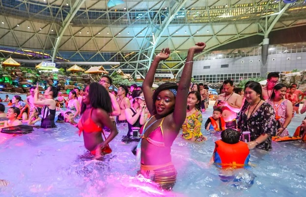 當(dāng)日,重慶市氣象臺(tái)發(fā)布高溫橙色預(yù)警,多個(gè)區(qū)縣氣溫達(dá)37°C以上。眾多市民和游客來(lái)到重慶洋人街水上樂(lè)園“以水為伴”,躲避高溫,樂(lè)享清涼。眾多市民和游客來(lái)到重慶洋人街水上樂(lè)園“以水為伴”,躲避高溫,樂(lè)享清涼。