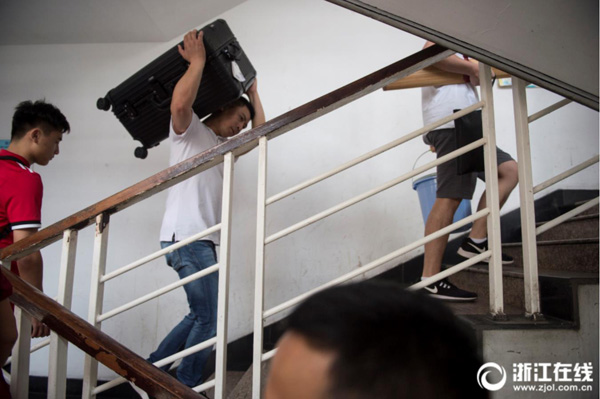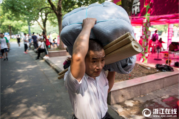 9月6日,又到一年開學季,下沙各高校校園內(nèi)堪比春運現(xiàn)場。校園里家長人數(shù)甚至超過了學生,最重的行李也往往都在父母的肩膀上。父母們不遠千里來送孩子上學,幫孩子背行李、代辦手續(xù)、打掃寢室衛(wèi)生,忙得不可開交。有的高校也在校園里豎起了讓孩子獨立的宣傳語。(浙江在線記者 馮賀 張孫超 見習記者 奕婷婷 攝)