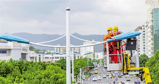 近日,在溫嶺人民路上,當(dāng)?shù)毓╇姽韭窡艄芾硭臋z修人員正在檢修路燈。為確保路燈設(shè)施正常運行,以亮麗的城市夜景迎接國慶,工作人員對管轄區(qū)內(nèi)的15500盞路燈進行了一次全面“體檢”。(記者 朱海偉)