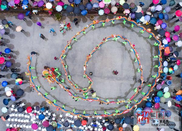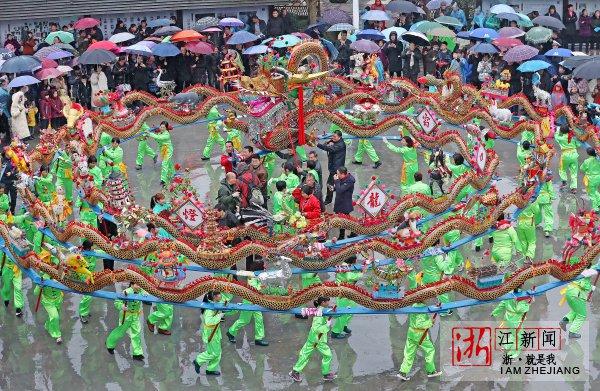 2月17日,在杭州富陽湖源鄉(xiāng)窈口村文化廣場上,一條長達130米、由58張板凳串聯(lián)而成的巨型板龍在綿綿細雨中游走舞動,拉開了湖源鄉(xiāng)別樣元宵、年味鄉(xiāng)愁活動。元宵佳節(jié)和傳統(tǒng)雨水節(jié)氣臨近,富陽湖源鄉(xiāng)以年味和鄉(xiāng)愁為主題,用特色傳統(tǒng)民俗表演,展示國家級生態(tài)文化村窈口村的美麗鄉(xiāng)村和獨特的山水自然環(huán)境,在濃濃的傳統(tǒng)山鄉(xiāng)喜慶氛圍中迎接元宵節(jié)到來。(記者 林云龍 拍友 劉亮 攝)