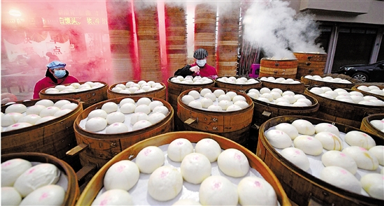 1月21日一大早,仙居縣埠頭鎮(zhèn)的美食店里就有一屜屜的饅頭出籠。當(dāng)?shù)匮缱郎嫌袛[放大紅印章饅頭的習(xí)慣,隨著春節(jié)臨近,饅頭需求量大增。 (拍友 王華斌 攝)