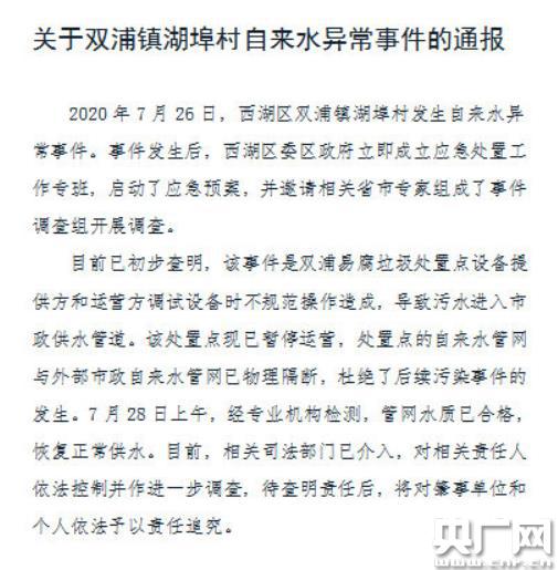 央廣網(wǎng)杭州7月30日消息(記者曹文君 范雨婷)7月30日下午,杭州西湖區(qū)通報(bào)了關(guān)于雙浦鎮(zhèn)湖埠村自來水異常事件的相關(guān)情況,全文如下: