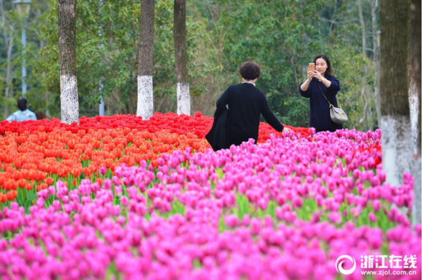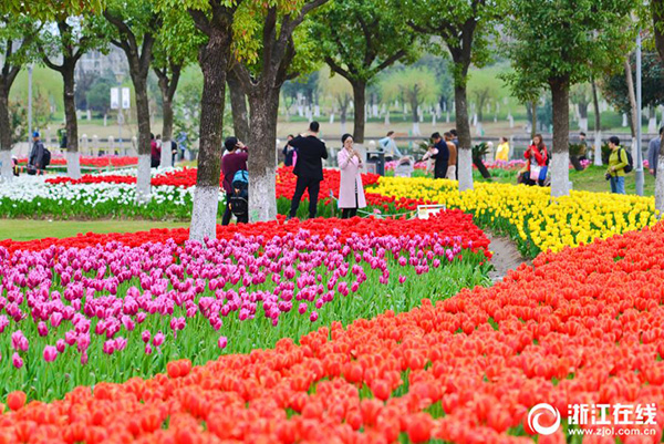 3月15日,寧波院士公園12萬株郁金香競(jìng)相開放,游人紛紛前來游覽,享受春光。 (殷福軍 攝)